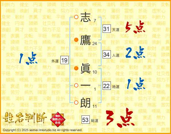志(7画)鷹(24画) 眞(10画)一(1画)朗(11画)