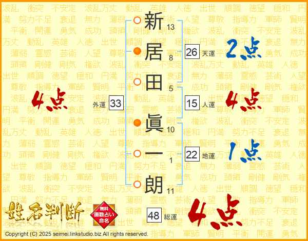 新(13画)居(8画)田(5画) 眞(10画)一(1画)朗(11画)