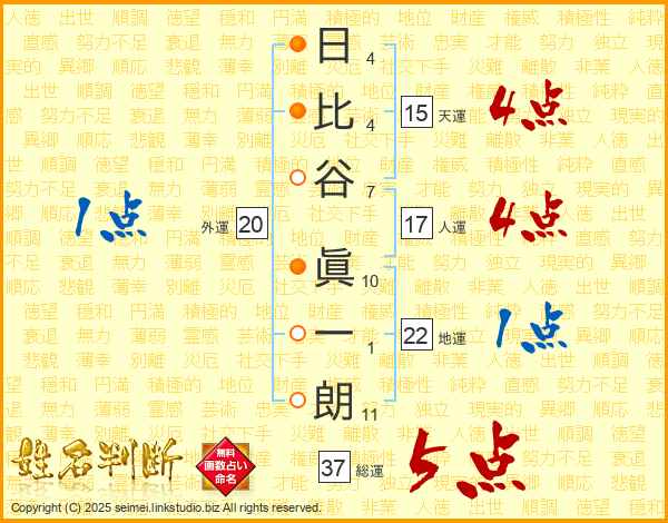 日(4画)比(4画)谷(7画) 眞(10画)一(1画)朗(11画)
