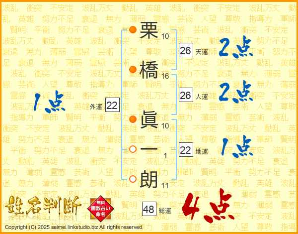 栗(10画)橋(16画) 眞(10画)一(1画)朗(11画)