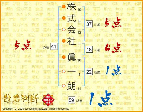 株(10画)式(6画)会(13画)社(8画) 眞(10画)一(1画)朗(11画)