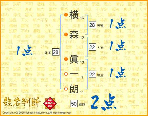 横(16画)森(12画) 眞(10画)一(1画)朗(11画)