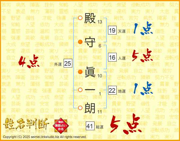 殿(13画)守(6画) 眞(10画)一(1画)朗(11画)