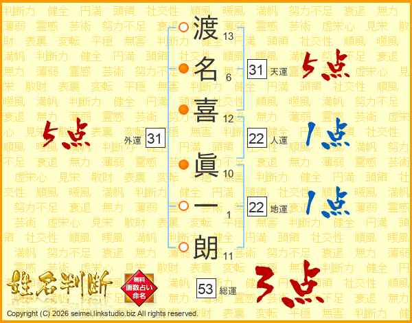 渡(13画)名(6画)喜(12画) 眞(10画)一(1画)朗(11画)