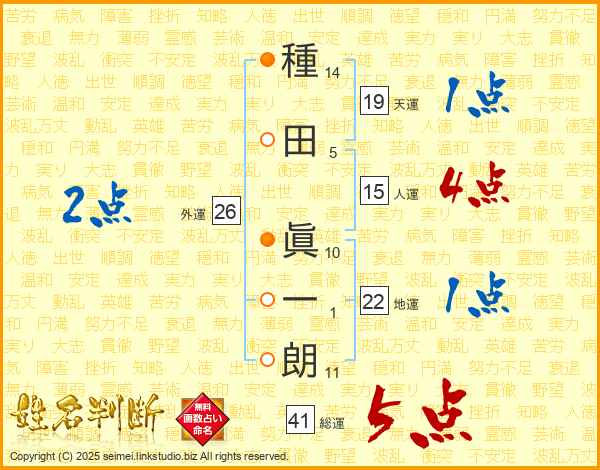 種(14画)田(5画) 眞(10画)一(1画)朗(11画)