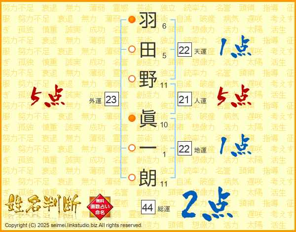 羽(6画)田(5画)野(11画) 眞(10画)一(1画)朗(11画)