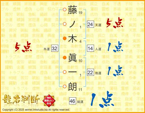 藤(19画)ノ(1画)木(4画) 眞(10画)一(1画)朗(11画)