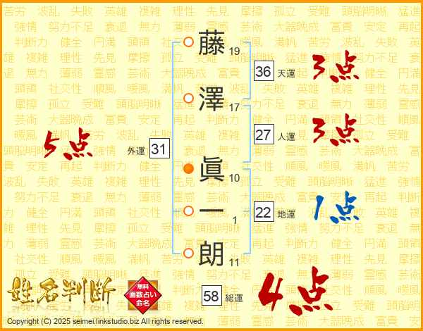 藤(19画)澤(17画) 眞(10画)一(1画)朗(11画)