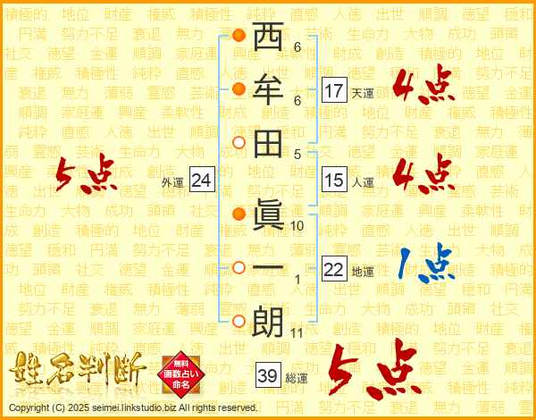 西(6画)牟(6画)田(5画) 眞(10画)一(1画)朗(11画)