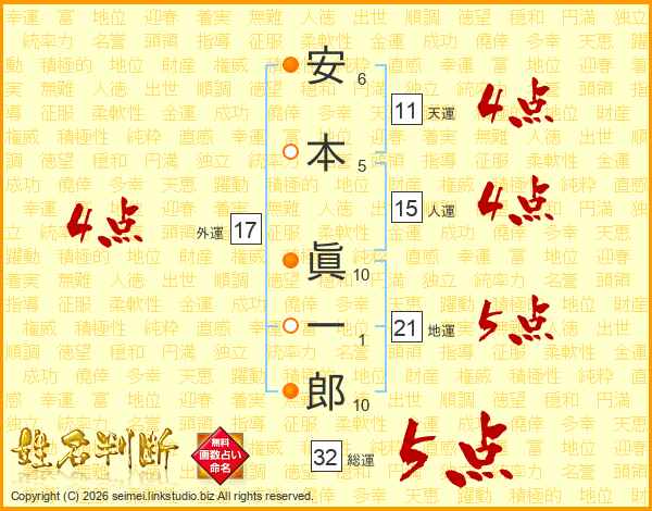 安(6画)本(5画) 眞(10画)一(1画)郎(10画)
