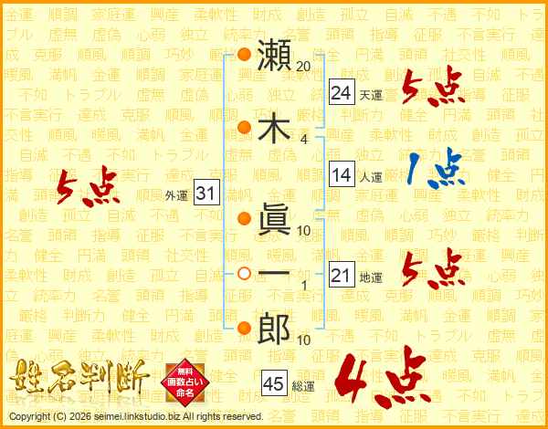 瀬(20画)木(4画) 眞(10画)一(1画)郎(10画)