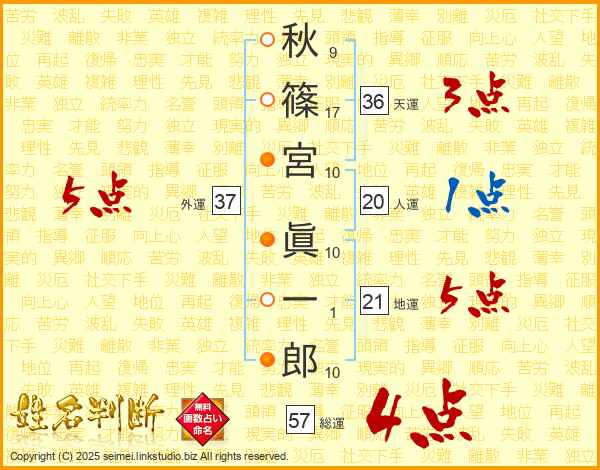 秋(9画)篠(17画)宮(10画) 眞(10画)一(1画)郎(10画)