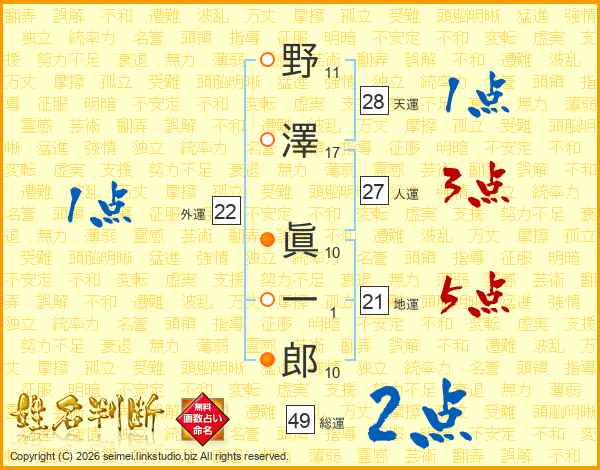 野(11画)澤(17画) 眞(10画)一(1画)郎(10画)
