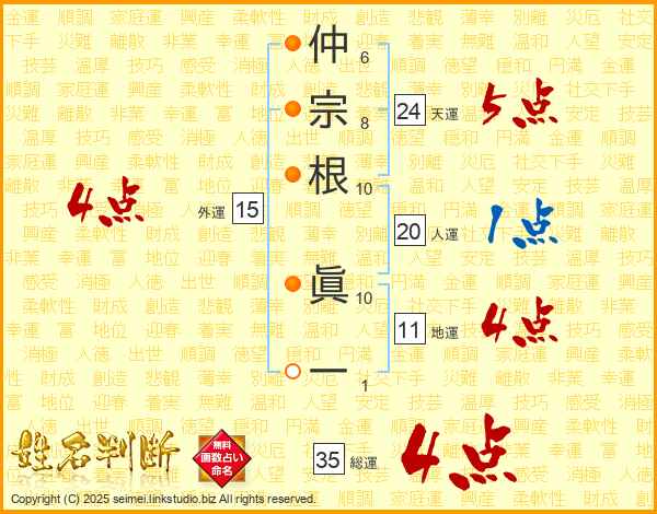 仲(6画)宗(8画)根(10画) 眞(10画)一(1画)