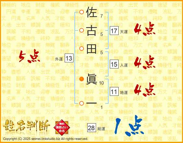 佐(7画)古(5画)田(5画) 眞(10画)一(1画)
