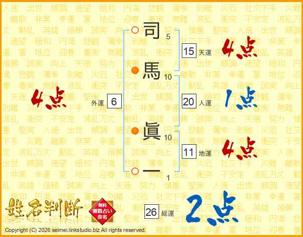 あなたの人生を表す1番重要な運勢です。生涯を通じて影響する総合運となり、主に50歳以降の晩年期に影響を及ぼします。苗字と名前の合計画数。