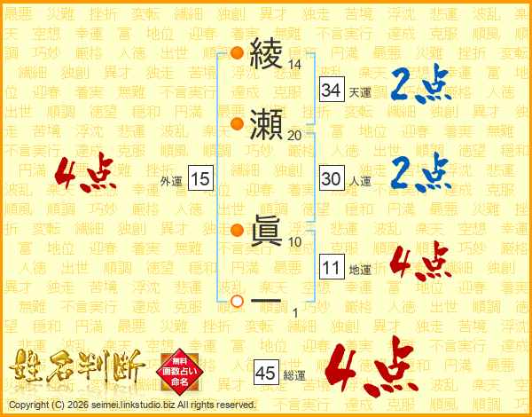 綾(14画)瀬(20画) 眞(10画)一(1画)