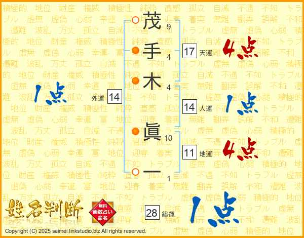茂(9画)手(4画)木(4画) 眞(10画)一(1画)