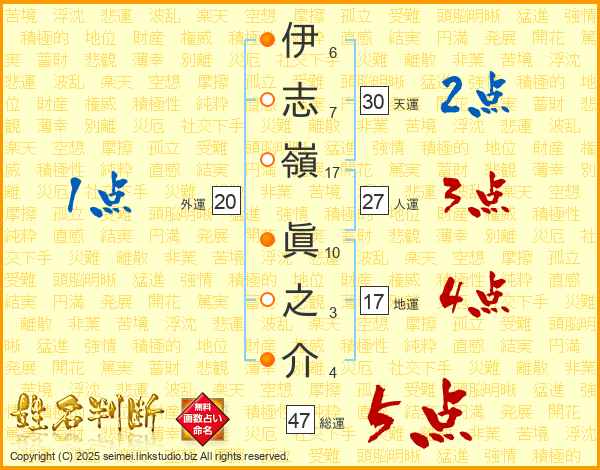伊(6画)志(7画)嶺(17画) 眞(10画)之(3画)介(4画)