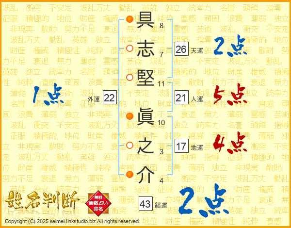 具(8画)志(7画)堅(11画) 眞(10画)之(3画)介(4画)