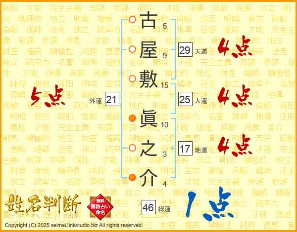 古(5画)屋(9画)敷(15画) 眞(10画)之(3画)介(4画)