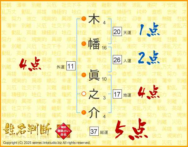 木(4画)幡(16画) 眞(10画)之(3画)介(4画)