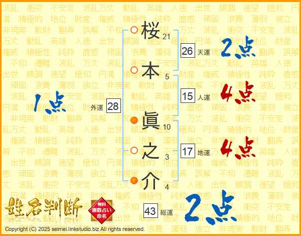 桜(21画)本(5画) 眞(10画)之(3画)介(4画)