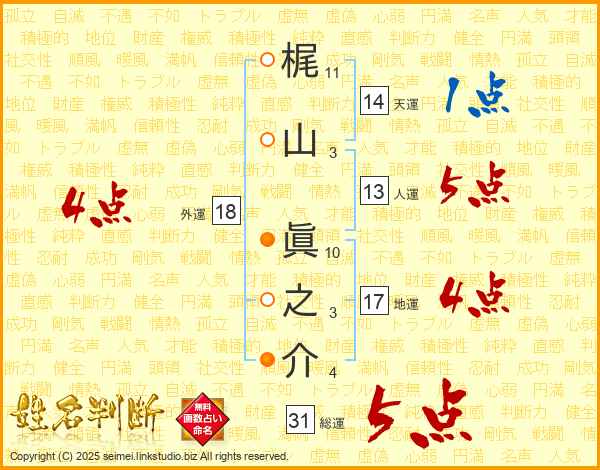 梶(11画)山(3画) 眞(10画)之(3画)介(4画)
