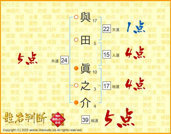 與(17画)田(5画) 眞(10画)之(3画)介(4画)