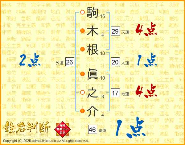 駒(15画)木(4画)根(10画) 眞(10画)之(3画)介(4画)