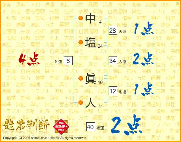 あなたの人生を表す1番重要な運勢です。生涯を通じて影響する総合運となり、主に50歳以降の晩年期に影響を及ぼします。苗字と名前の合計画数。