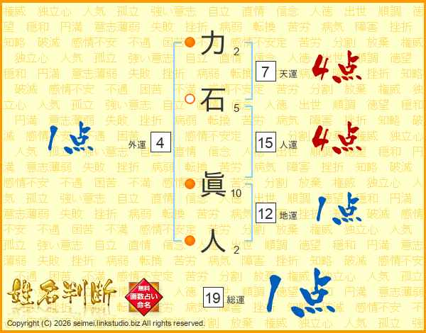 生活面を象徴する運勢です。外部から受ける影響力を表し、結婚運、家庭運や職場、環境への順応性を表します。総運から人運を引いた画数。姓や名が1文字の場合を除く。