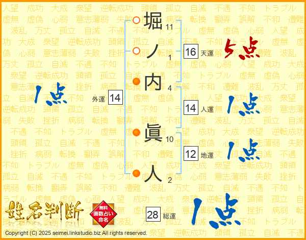 堀(11画)ノ(1画)内(4画) 眞(10画)人(2画)