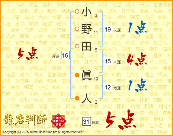 小(3画)野(11画)田(5画) 眞(10画)人(2画)