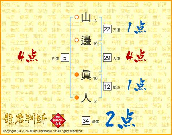 生活面を象徴する運勢です。外部から受ける影響力を表し、結婚運、家庭運や職場、環境への順応性を表します。総運から人運を引いた画数。姓や名が1文字の場合を除く。