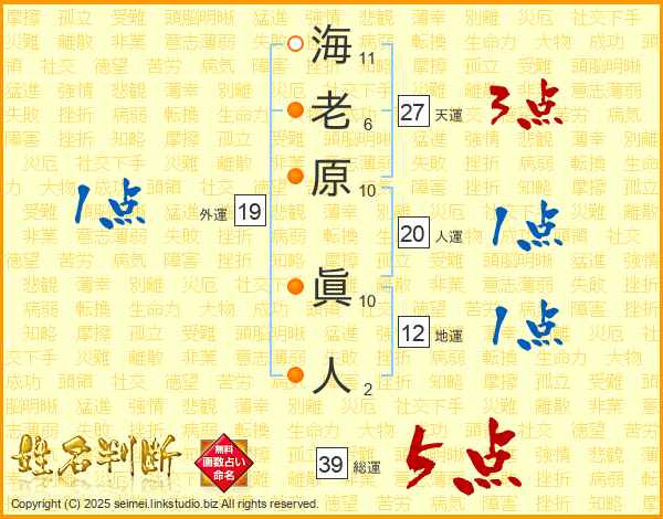 海(11画)老(6画)原(10画) 眞(10画)人(2画)