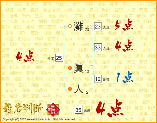 生活面を象徴する運勢です。外部から受ける影響力を表し、結婚運、家庭運や職場、環境への順応性を表します。総運から人運を引いた画数。姓や名が1文字の場合を除く。