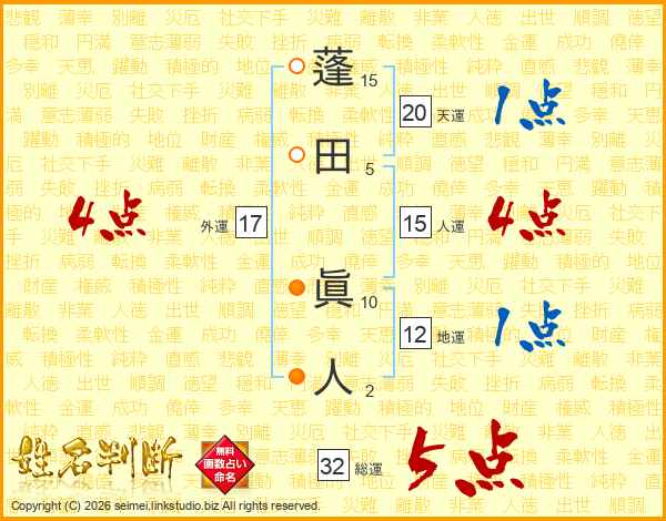 蓬(15画)田(5画) 眞(10画)人(2画)