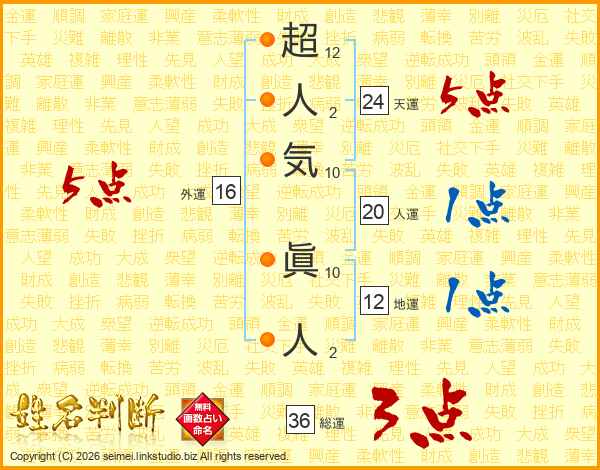 超人気眞人さんの総運は36画の3点!