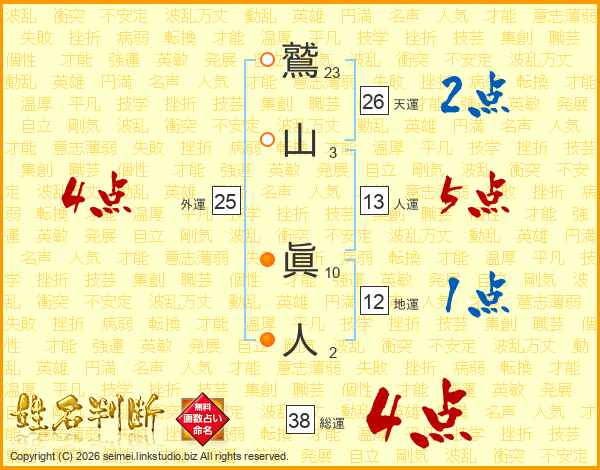 鷲(23画)山(3画) 眞(10画)人(2画)