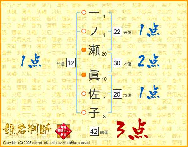 一ノ瀬眞佐子さんの総運は42画の3点!