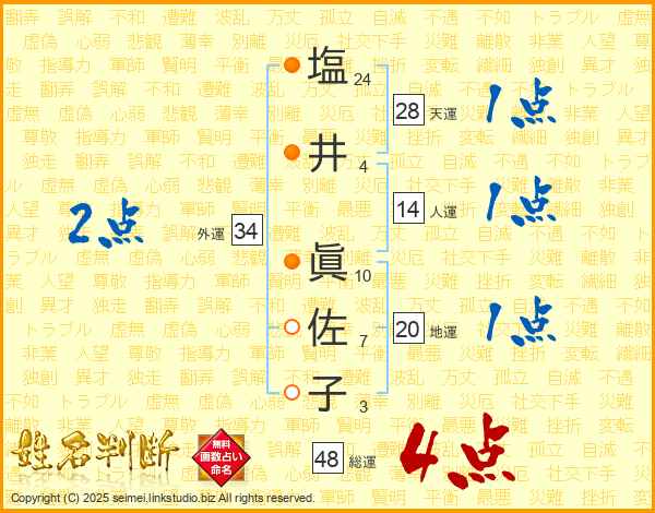 塩(24画)井(4画) 眞(10画)佐(7画)子(3画)