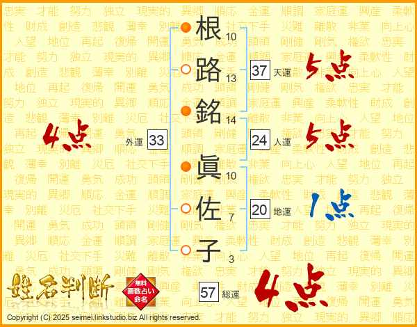 根(10画)路(13画)銘(14画) 眞(10画)佐(7画)子(3画)