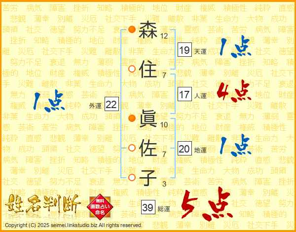 森(12画)住(7画) 眞(10画)佐(7画)子(3画)