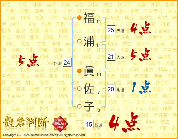 福(14画)浦(11画) 眞(10画)佐(7画)子(3画)