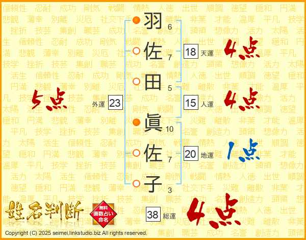 羽(6画)佐(7画)田(5画) 眞(10画)佐(7画)子(3画)