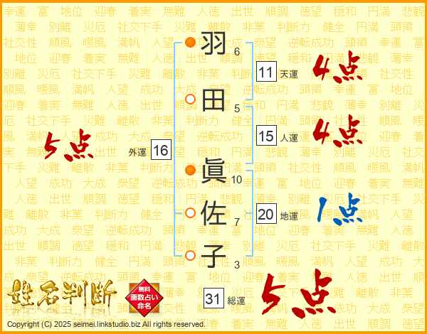 羽(6画)田(5画) 眞(10画)佐(7画)子(3画)