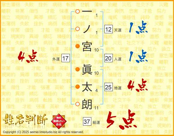 一(1画)ノ(1画)宮(10画) 眞(10画)太(4画)朗(11画)
