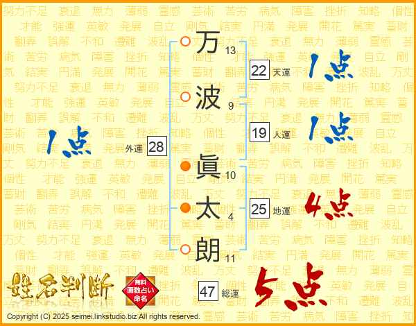 万(13画)波(9画) 眞(10画)太(4画)朗(11画)