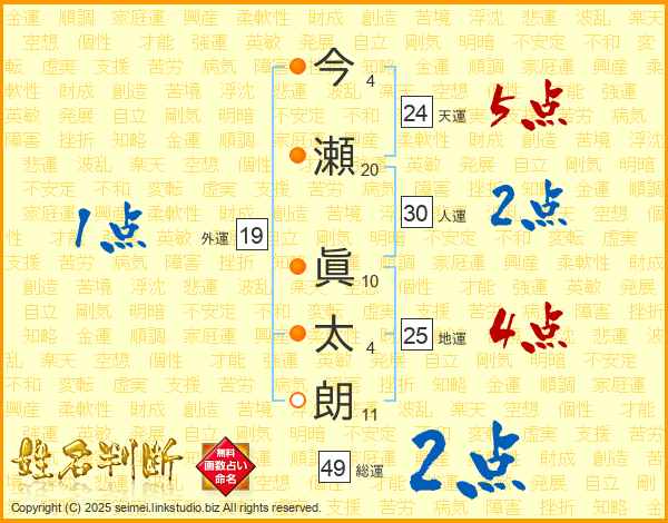 今(4画)瀬(20画) 眞(10画)太(4画)朗(11画)